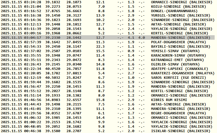KANDİLLİ RASATHANESİ SON DEPREMLER LİSTESİ VERİLERİ