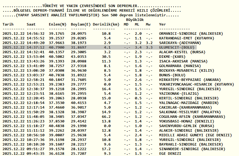 Bolu'da deprem mi oldu, kaç şiddetinde? 22 Aralık AFAD ve Kandilli Rasathanesi son depremler listesi