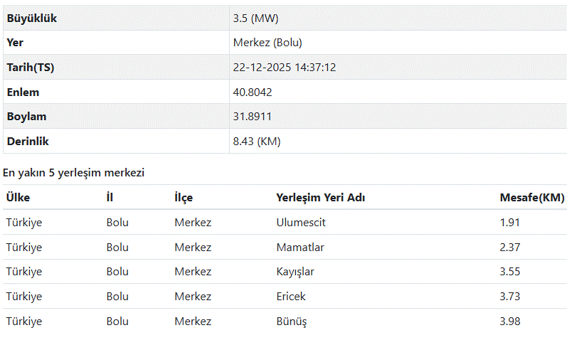 AFAD ve Kandilli Rasathanesi son depremler listesi verilerine göre Bolu deprem detayları şöyle;