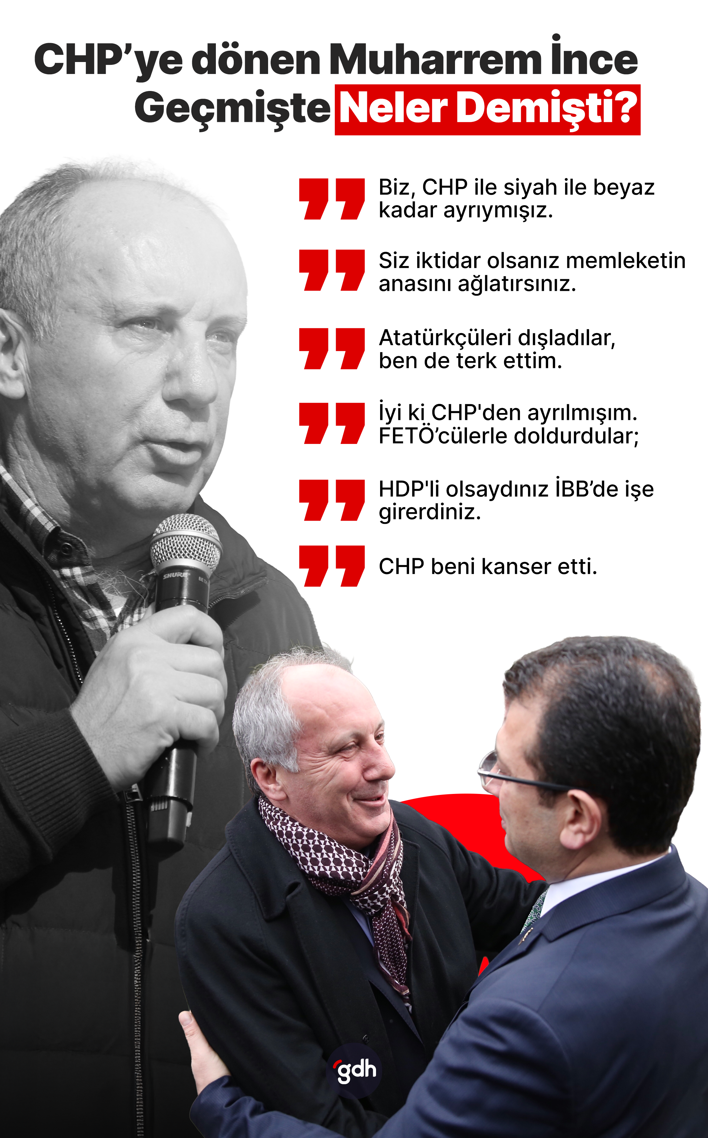 Memleket Partisi'ni kurduktan sonra yeniden CHP saflarına geçen Muharrem İnce'nin geçmişte CHP hakkında yaptığı sert açıklamalar yeniden gündeme geldi. İnce, CHP için zamanında “FETÖ’cüleri doldurdular” ve “Zavallı CHP” ifadelerini kullanmıştı.