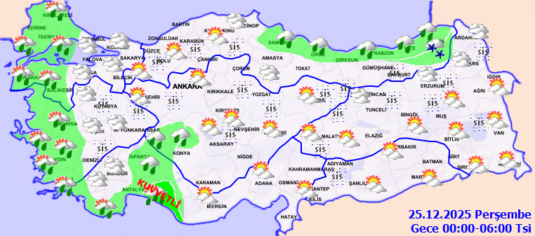 Ülkemiz genelinin parçalı yer yer çok bulutlu, Marmara'nın batısı, Kıyı Ege, Batı Akdeniz, Orta ve Doğu Karadeniz kıyıları ile Manisa, Yozgat, Sivas, Tokat, Sinop, Artvin çevreleri, Denizli'nin batısı, Konya'nın kuzey ve batısı ile bu sabah saatlerinde Zonguldak ve Bartın çevrelerinin yağışlı geçeceği tahmin ediliyor.