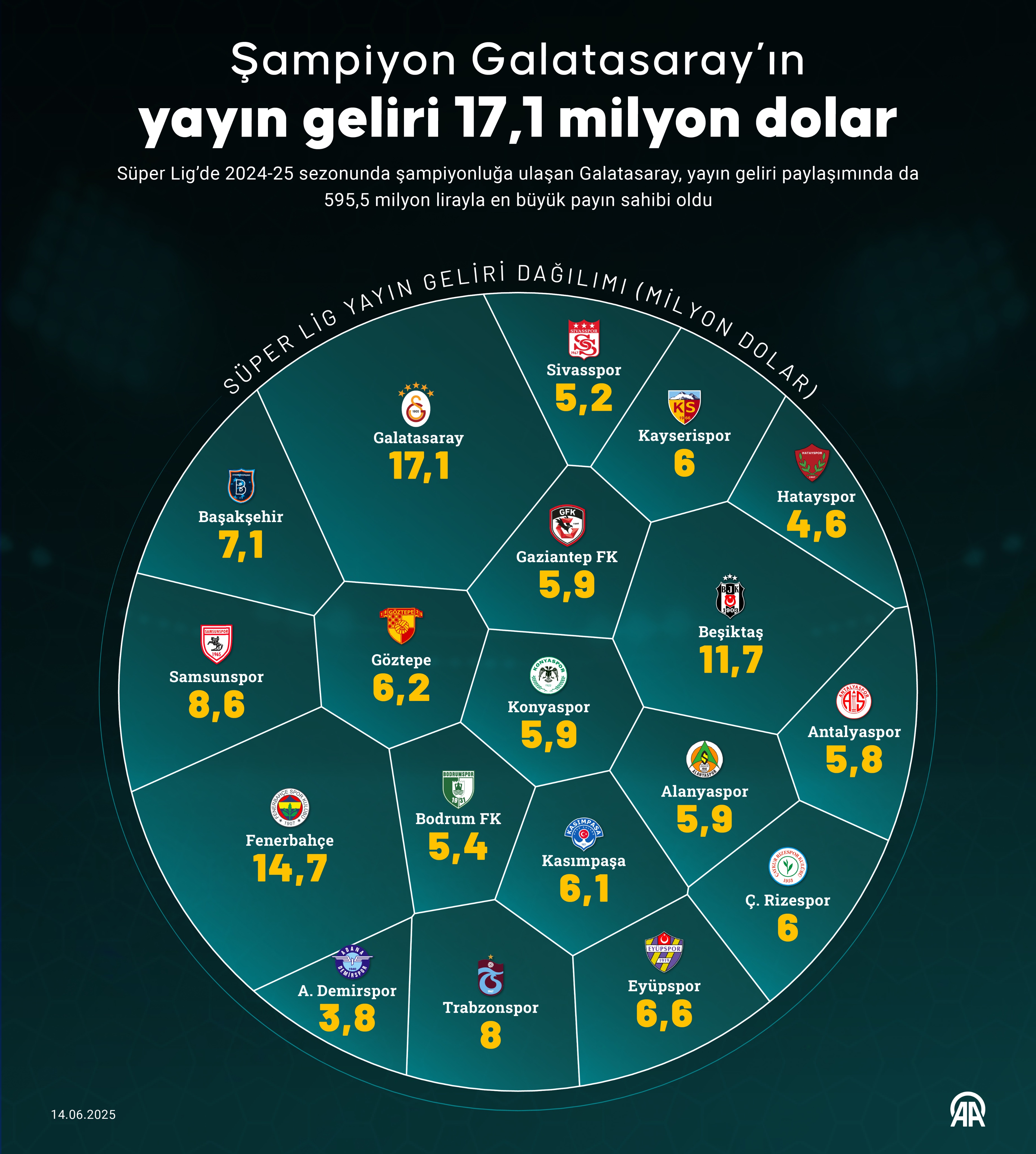 - Galatasaray, 2024-25 Süper Lig sezonunun yayın gelirinde 17.1 milyon dolarla en büyük payı aldı.